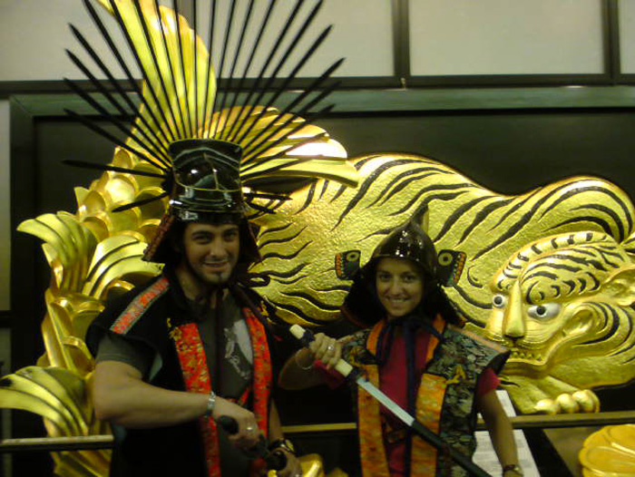 Tensy y Javier decidieron pasar su Luna de Miel en Japon y en Osaka de vistieron de guerreros samurais para su foto de recuerdo. Tambien visitaron Miyajima en Hiroshima y aqui posan frente a la Tori Flotante que es el simbolo de Miyajima.
